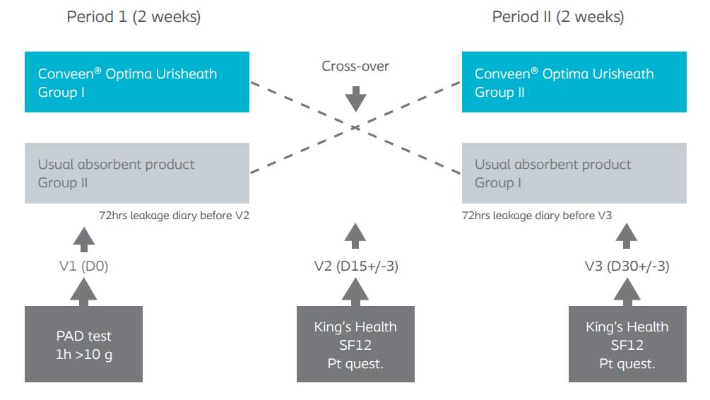 - Deltakerne testet Conveen® Optima uridomer (Coloplast A/S, Denmark) med urinposer og deres vanlige absorberende produkt i en 2 ukers periode i tilfeldig rekkefølge.