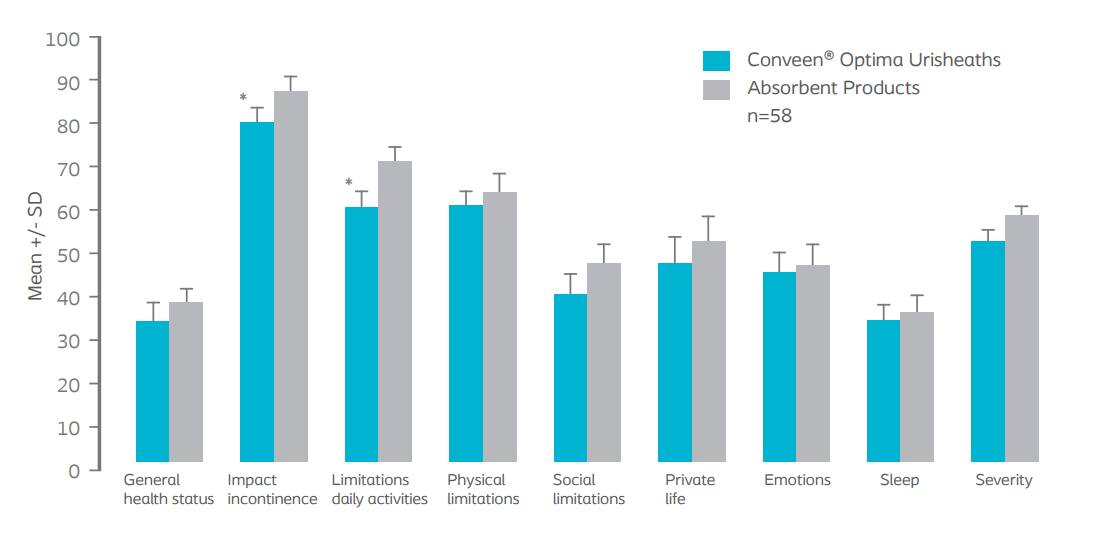 - Conveen Optima uridomer viste en positiv innvirkning på QoL (I følge KHQ resultater) hos moderate til alvorlig inkontinens hos menn, som var langtidsbrukere av absorberende produkter.